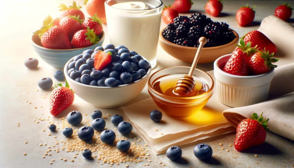 - ブレンダーにベリー、ヨーグルト、ハチミツを入れます。