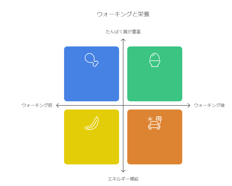ウォーキングを行う前には、適度なエネルギー補給が大切です。例えば、バナナやヨーグルト、ナッツなどの軽い食事を摂ることで、脂肪燃焼がスムーズに行われます。朝にウォーキングを行う場合、空腹のままではエネルギー不足になりがちなので、軽く食べてからスタートするのがオススメです。