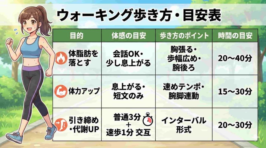 | 目的 | 体感の目安 | 歩き方のポイント | 時間の目安 |