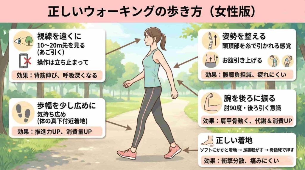 - 注意:前のめりは腰痛の原因。胸を軽く張り、みぞおちから前へ進む感覚で歩きましょう。腰だけを反らすのはNGです。
