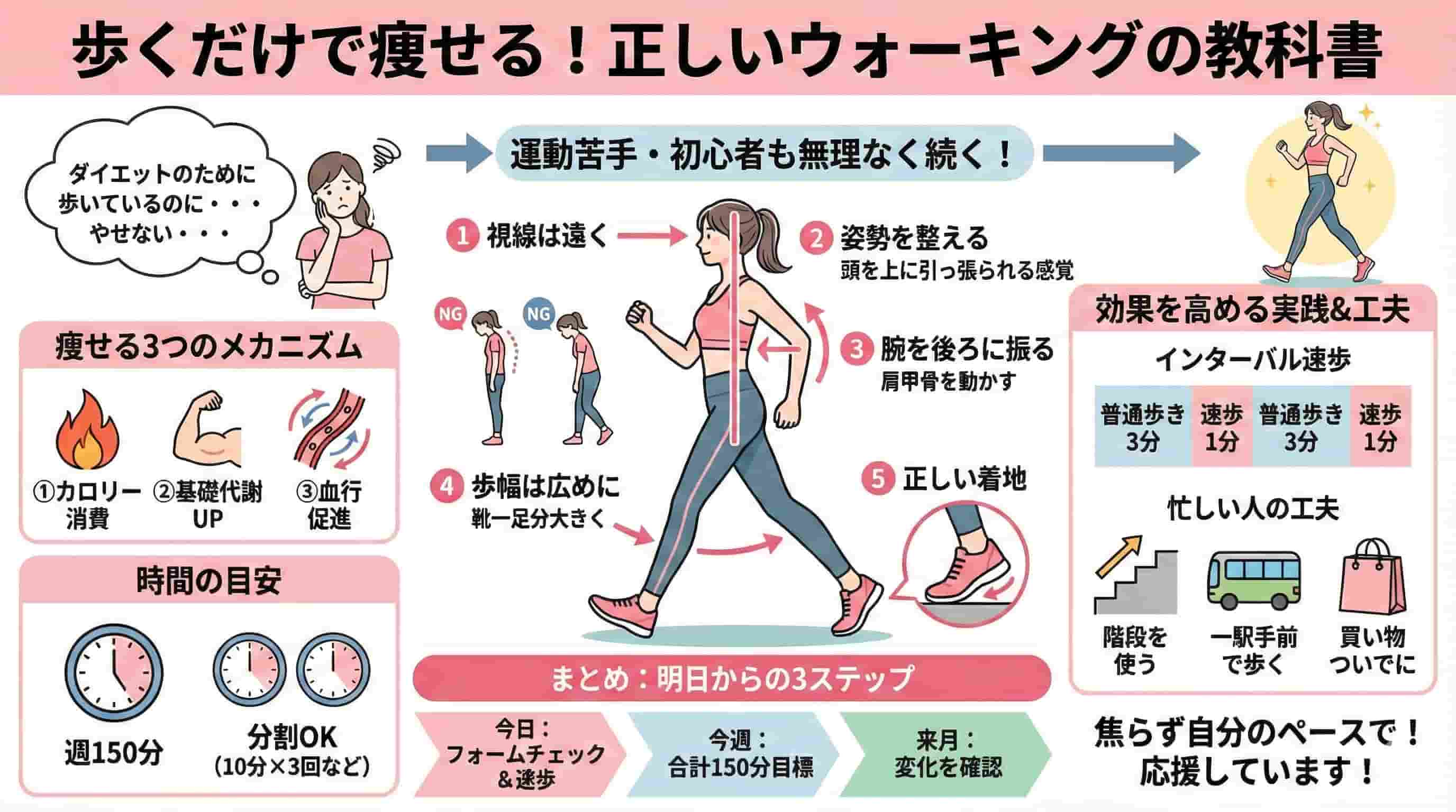 痩せる歩き方は「姿勢・歩幅・ちょうどよい強度」をそろえるのが大切です。無理に長時間歩かなくても、分割して150分を積み重ねれば十分。記録を残すことで続けやすさも増します。