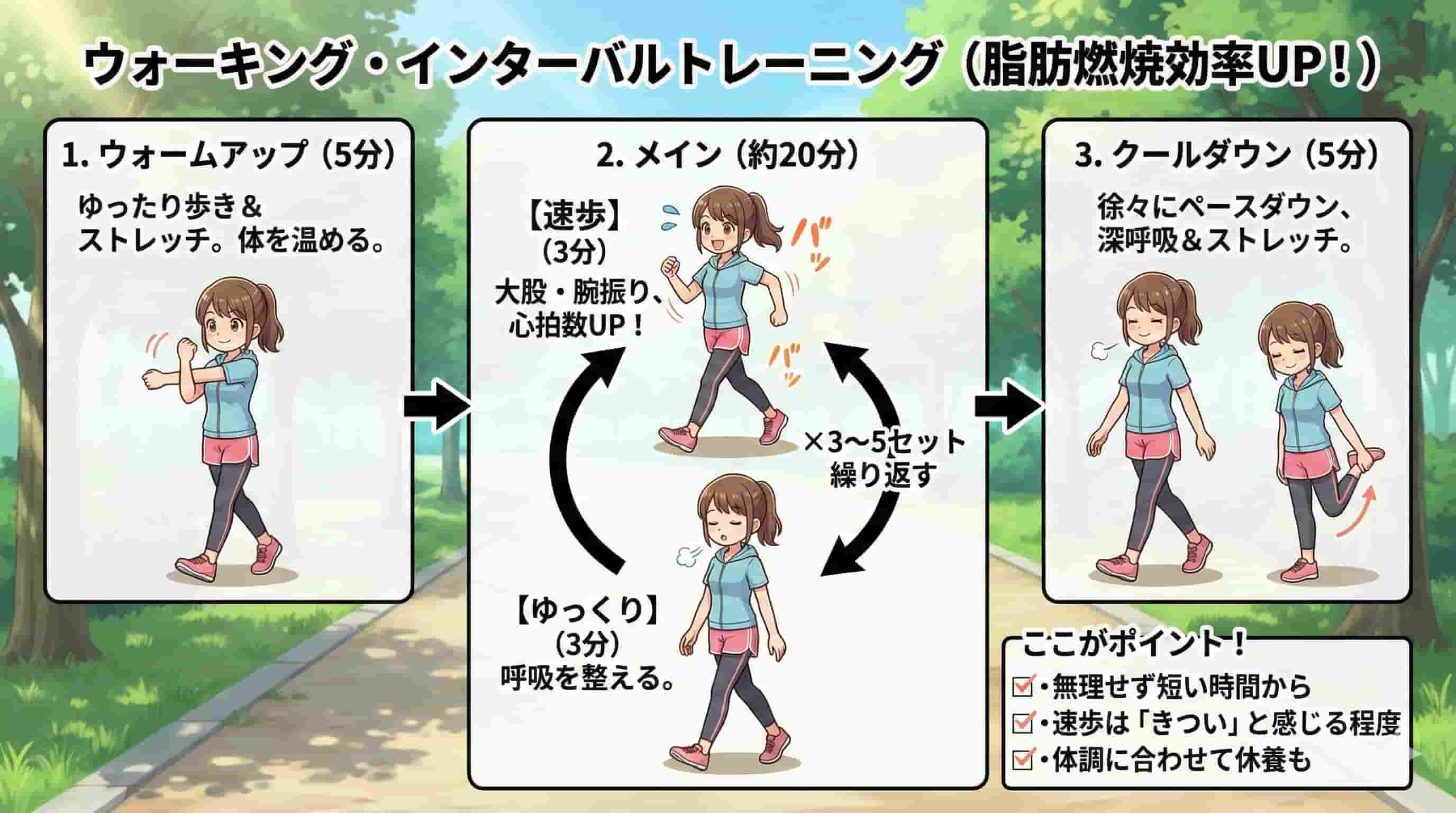 インターバルトレーニングは、短時間で高い脂肪燃焼効果を得られるエクササイズです。 ウォーキングの中にインターバルを組み込むことで、より効率的に脂肪を燃やすことが可能です。