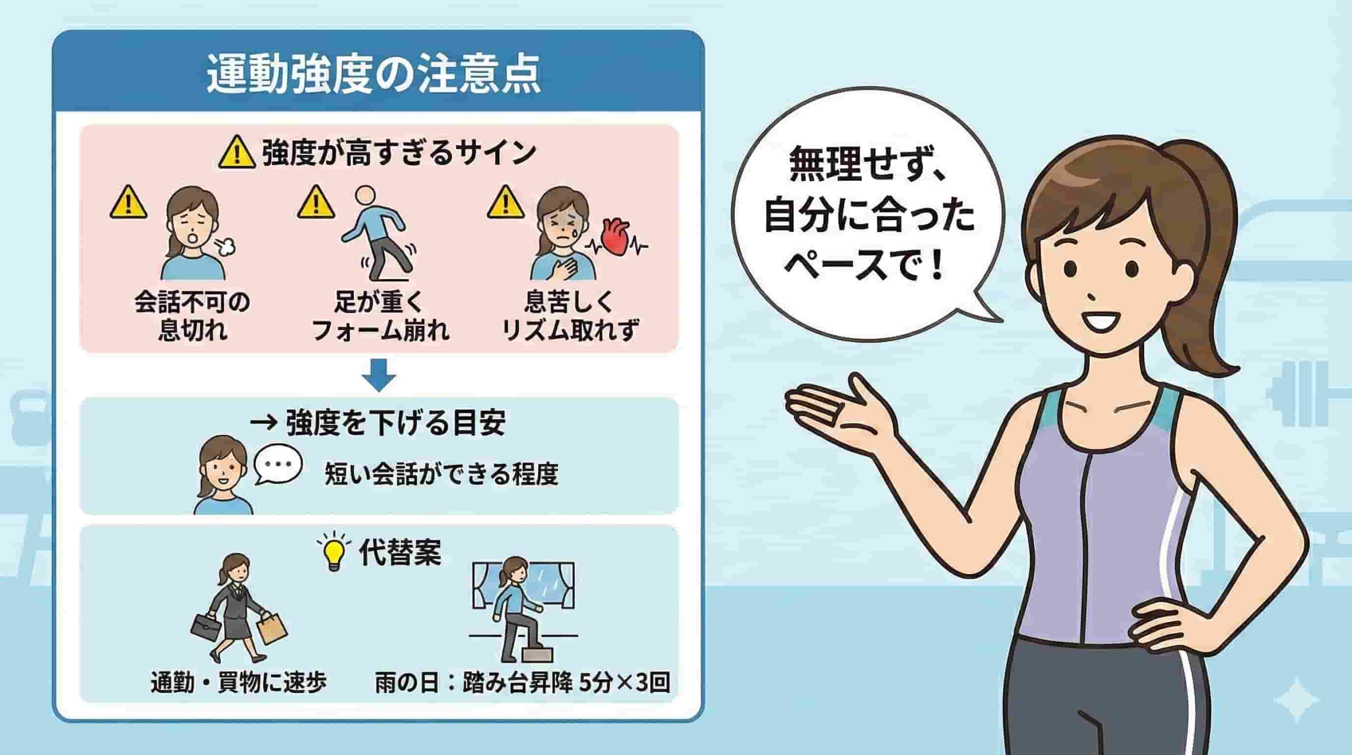 - 代替案:通勤や買い物の一部を速歩に切り替え。雨の日は踏み台昇降5分×3回でも代用可能。